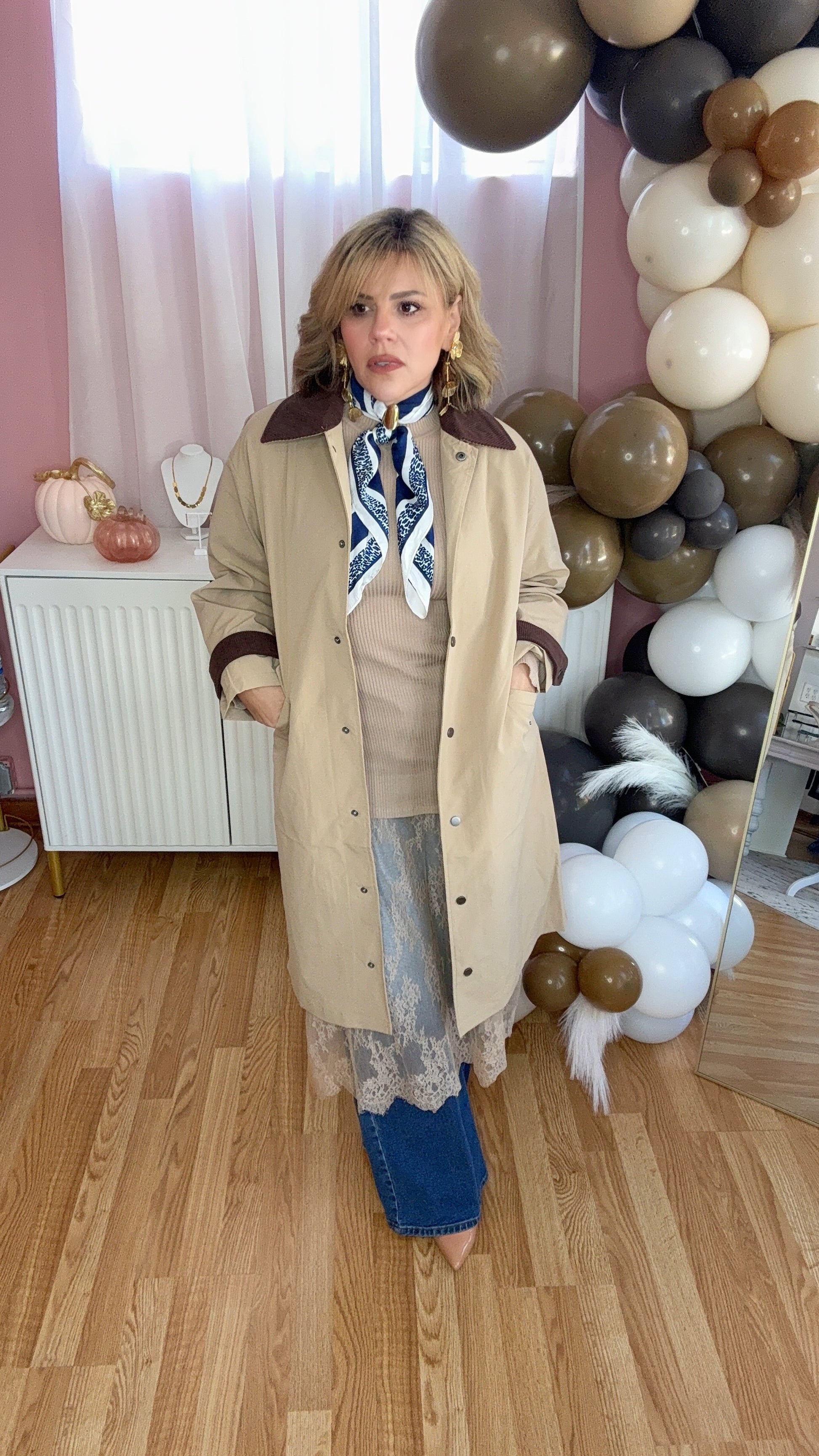 Seamlessly transition this chic trench from fall to spring — a versatile, elevated piece every wardrobe deserves. Available in Small, Medium, and Large. Styled here in a Medium on Mariela’s 5’4” frame (34B-27-42).