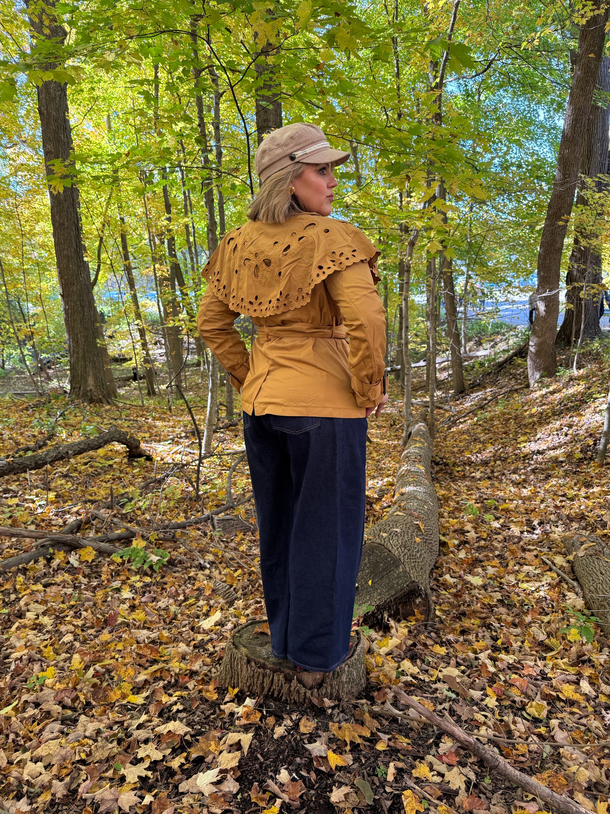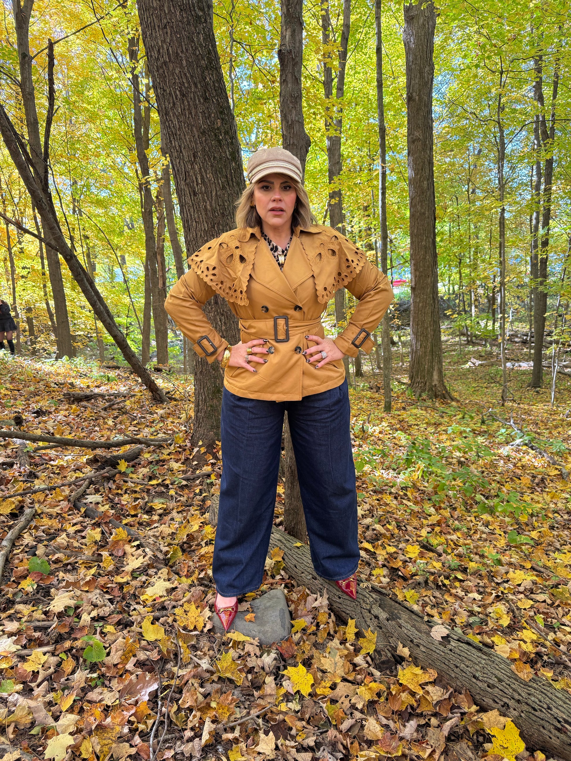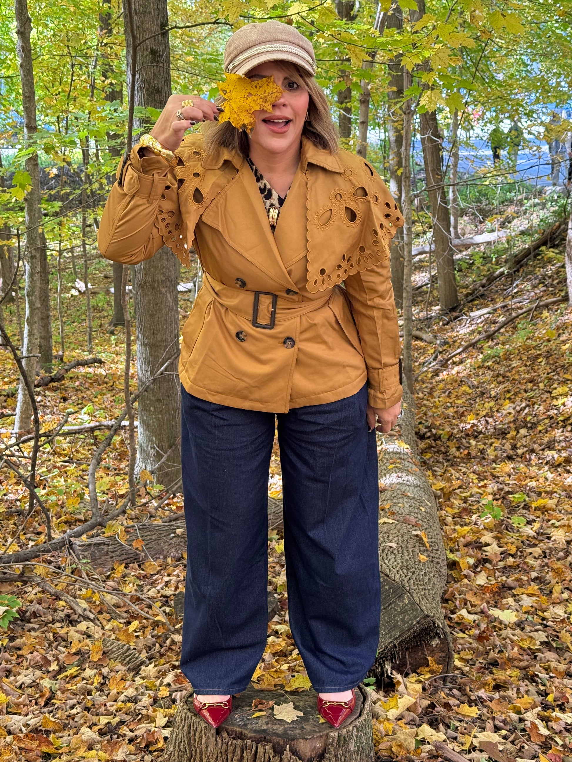 Perfect for autumn, this standout piece is designed to turn heads wherever you go — a true statement trench coat for the modern, fashion-forward wardrobe. Available in Small, Medium, and Large, styled here in a Medium on Mariela’s 5’4” frame (34B-27-42).