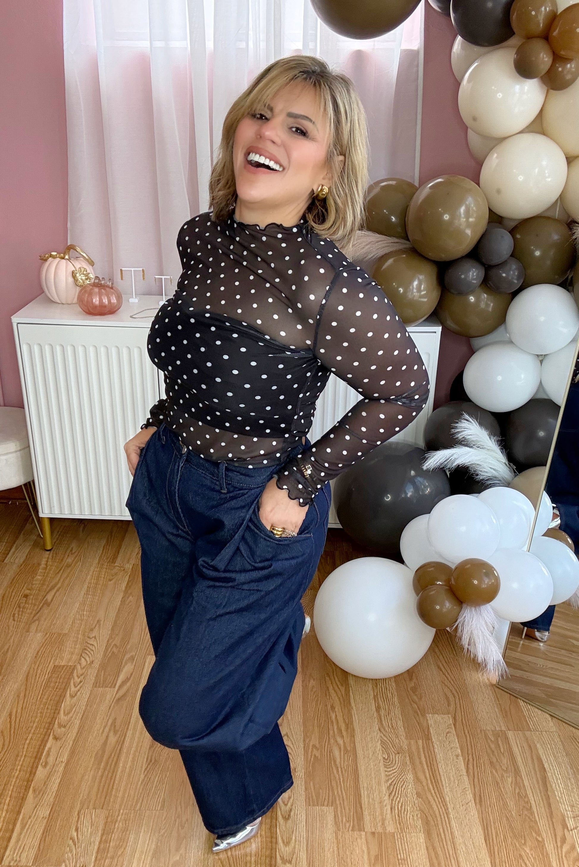 Turn heads this season with our Midnight Dots Mesh Top, a standout piece from the Fall Must Haves Collection. This black and white polka dot mesh top blends trend-forward sheer fabric with a flattering fit, creating a versatile, chic statement for any fall outfit.