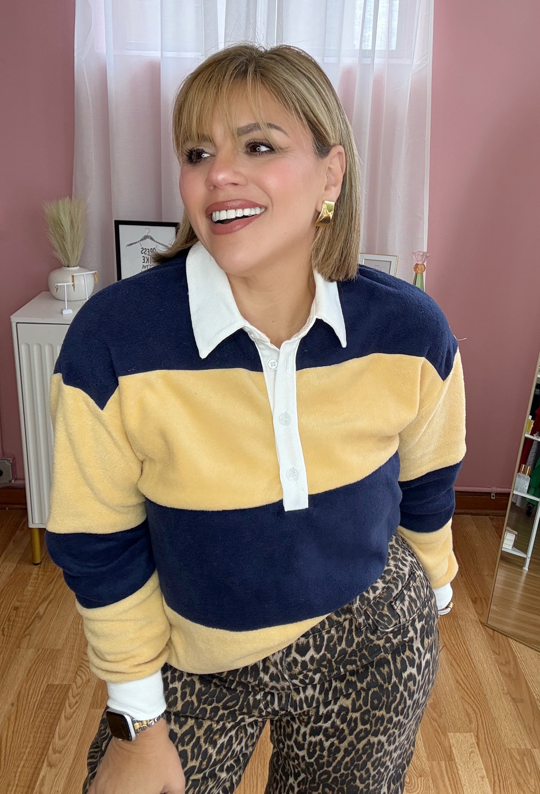 Stay cozy and on-trend with this long sleeve rugby striped fleece polo in bold navy and yellow. Designed in a soft fleece fabric, it brings both comfort and effortless style—perfect for transitioning into cooler days. The collared neckline and classic rugby stripes give it that sporty-chic vibe, making it easy to dress up with jeans or keep casual with leggings.
