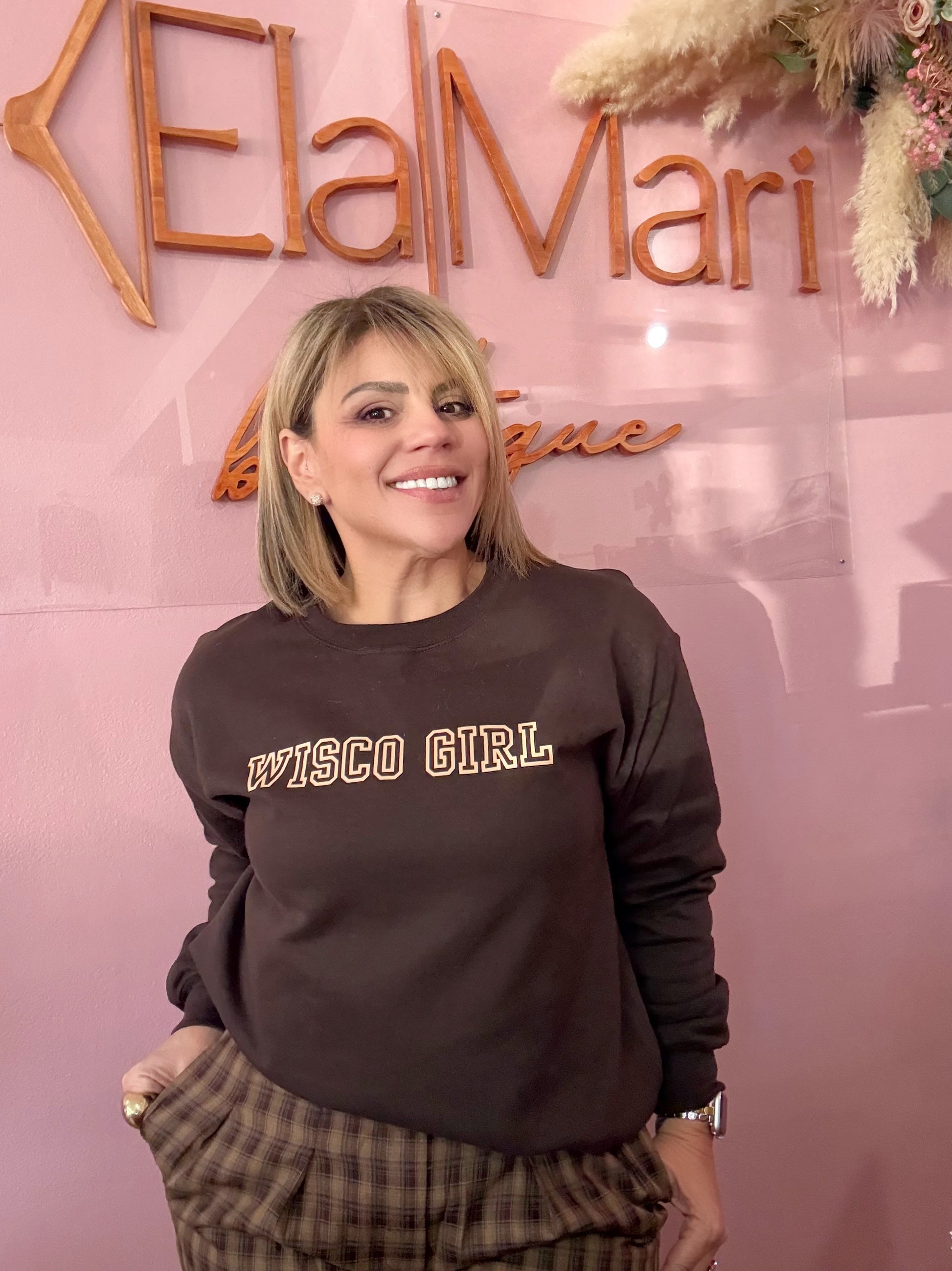 The “Wisco Girl” lettering adds that sporty touch that shows your Wisconsin pride with a fashionable twist. Whether you’re heading to a fall market, grabbing your favorite latte, or just staying cozy at home, this piece is the perfect mix of cute, casual, and warm.